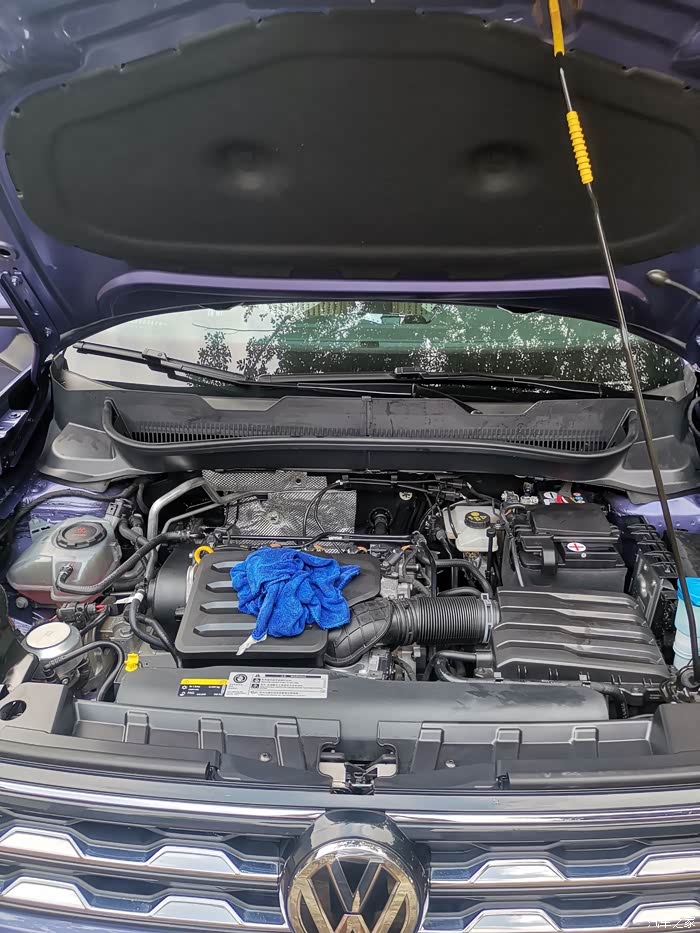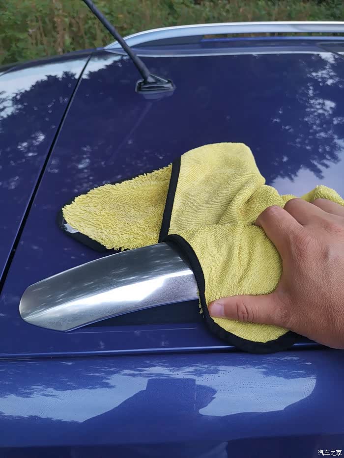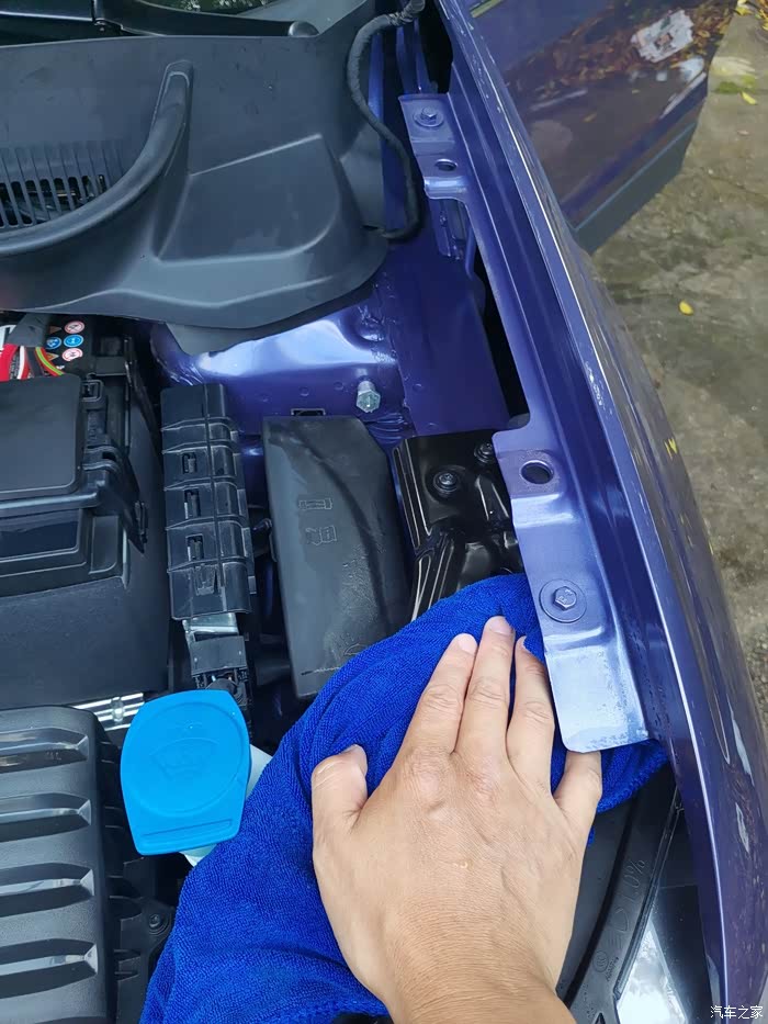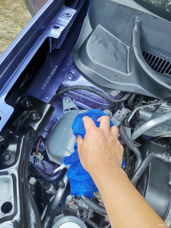 最后将发动机机舱盖打开,将机舱盖内的残留水渍擦拭干净。