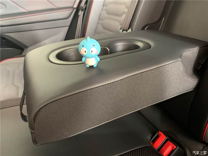 途观X后排座椅带中央扶手,两个杯托设计,非常的体贴。