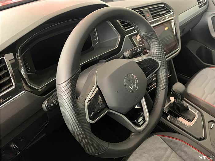 途观X采用全新R-line专属触控式三幅真皮多功能方向盘打孔处理,握感非常的舒服,另外方向盘上的LOGO采用了品牌全新LOGO设计。