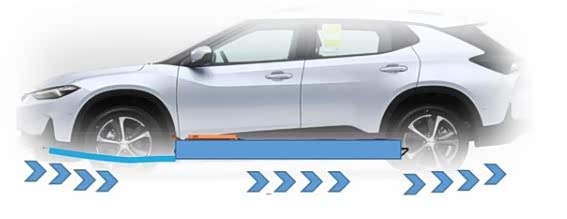 平整的底盘,同时考虑底盘导流板设计,以及平整的动力电池布置,使得底盘下的空气流场更加顺畅,有效的减小风阻,提升续航。