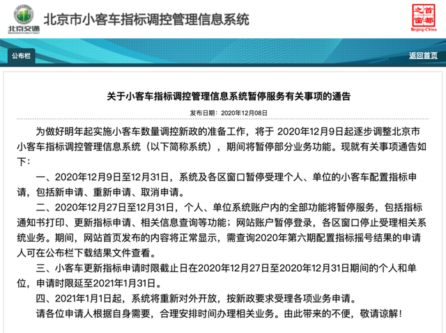 从北京市小客车指标调控管理信息系统官网获悉,为做好明年起实施小客车数量调控新政的准备工作,将于2020年12月9日起逐步调整北京市小客车指标调控管理信息系统(以下简称系统),期间将暂停部分业务功能,直至2021年1月1日,系统才重新对外开放,按新政要求受理各项业务申请。