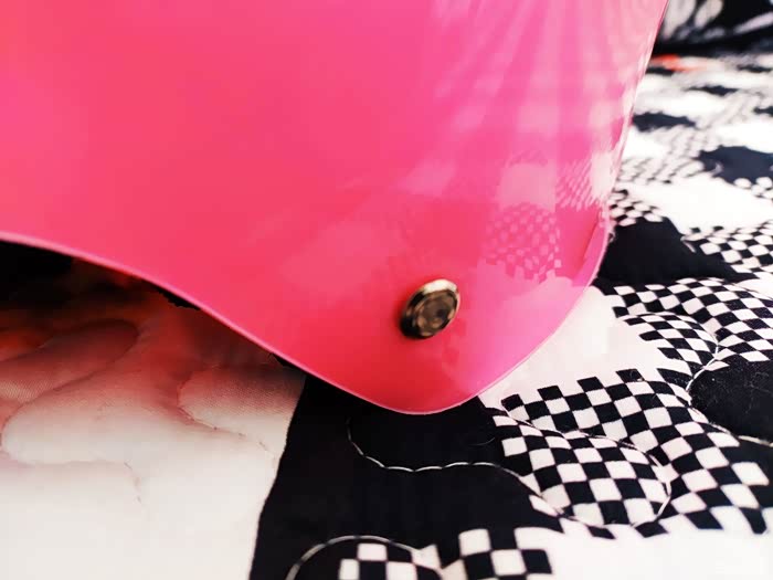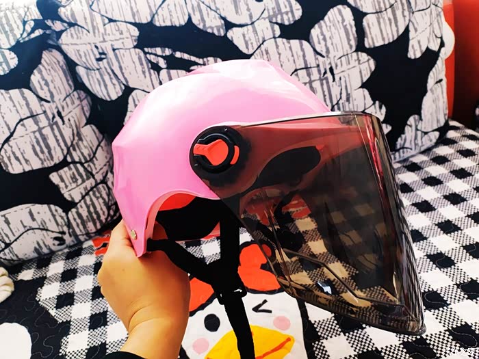 大家好,我是鹏言,今天我为大家带来一款电动车摩托车头盔,这款头盔是粉色的,因为这是我为老婆购买的。这款头盔拿在手上非常的轻便,外壳塑料是加强ABS的面料,头盔里面带有海绵内垫,这款不仅夏天可以用冬天也是可以用的,有人说冬天用不冷吗,其实冬天你可以里面带个帽子啊,头盔内部有一个黑色的圈圈可以调节大小的,夏天使用时有防紫外线的面罩,眼睛会很舒适哦。当然前面的面罩你如果不喜欢也是可以拆下来的,左右两边有个卡扣,按下去拉出来就可以。绳子是可以调节大小的,根据自己的脸型自己调节。