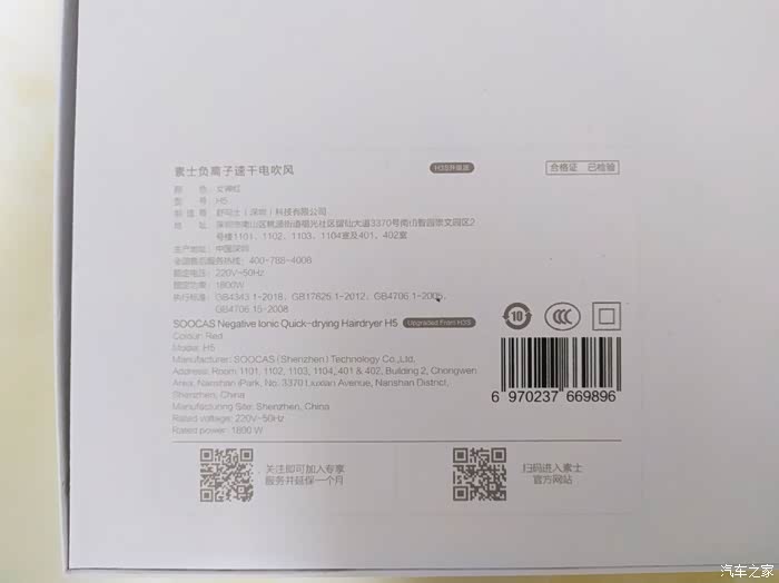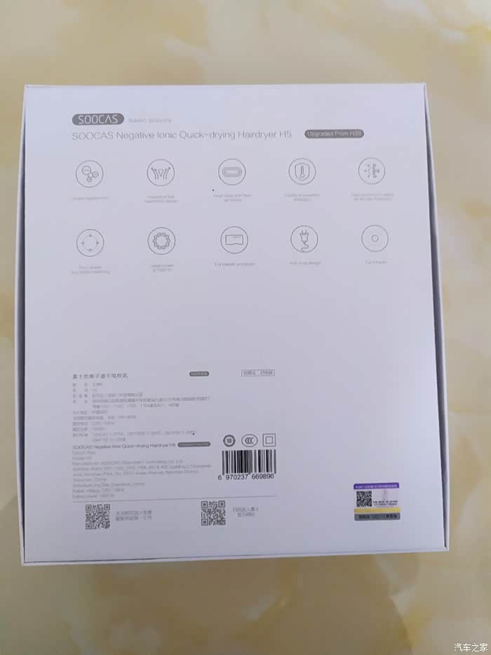背面是电吹风的特点、优点和更详细的商品标签以及防伪等。