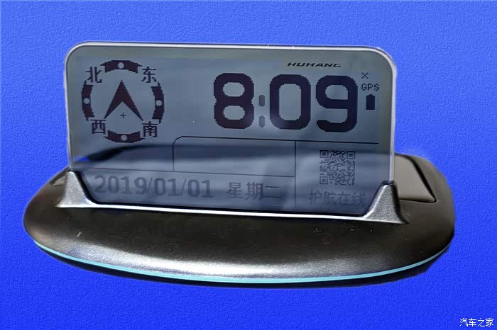 打开底部开关,HUD的画面如图所示,在未搜索到GPS信号的情况下,默认的日期是2019/01/01,时间是早上8:00。