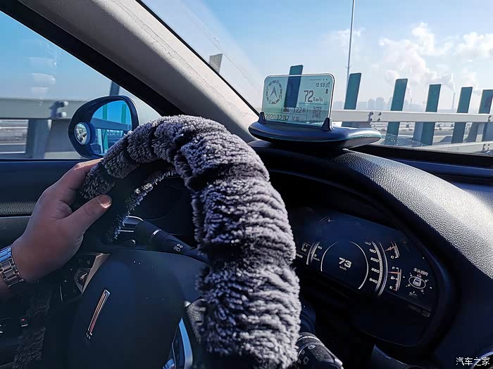 这是在路上行驶时,老婆帮忙拍下的照片,此时仪表盘显示的车速是73km/h,HUD抬头显示器的显示速度是72km/h,相差1km/h,这个误差对于汽车来说可以忽略不计,显示速度还是比较准确的。