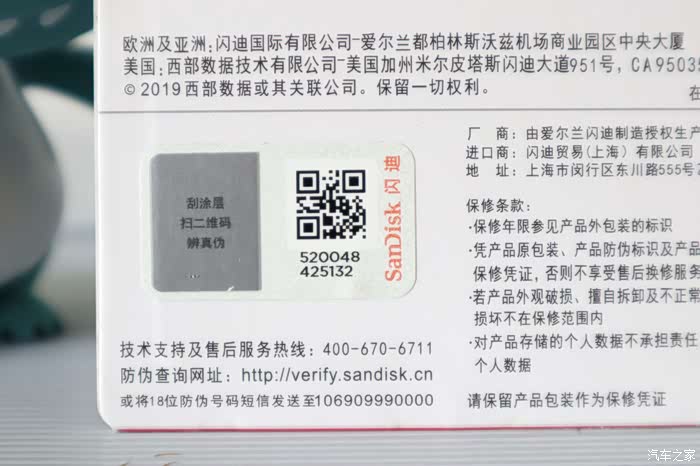发面简单的文字介绍,防伪的二维码带有防伪涂层。老板说刮开涂层可查真伪。我相信既然敢做上防伪涂层,刮开的二维码肯定是正确的。但是,是不是真品我还是无从考究。最上方印有醒目的红字,至尊高速移动存储卡;