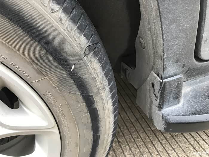 这里就是爆胎位置,侧面和底部一条大约8厘长的口子,这条轮胎都不用修补了,可以报废了,轮毂还得带回去拆下来啊,幸亏胎压监测及时告警,轮毂丝毫无损,没有变形。很多车友没有胎压监测,爆胎了还继续行驶,最后轮毂都颠簸变形了,得不偿失啊!