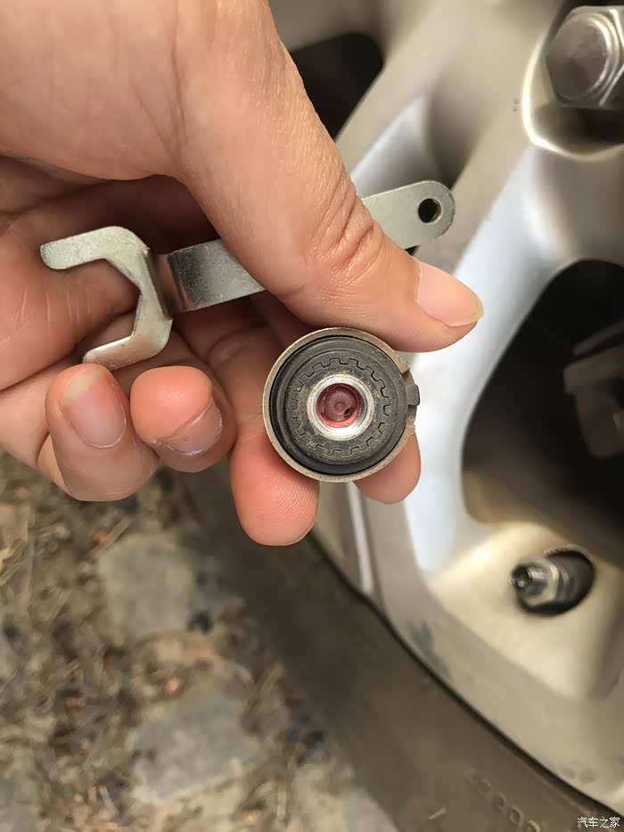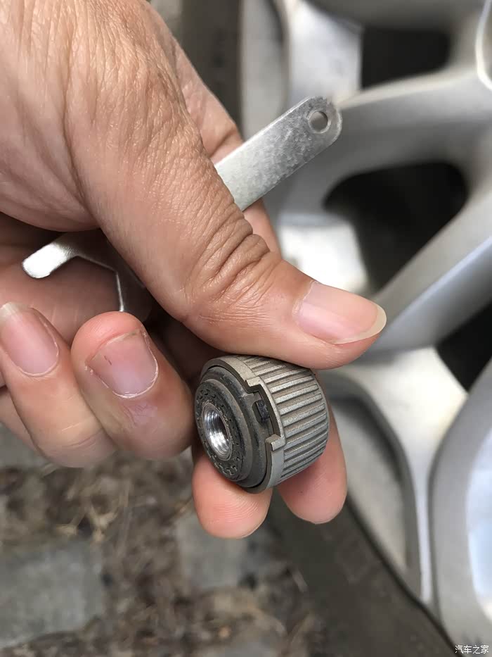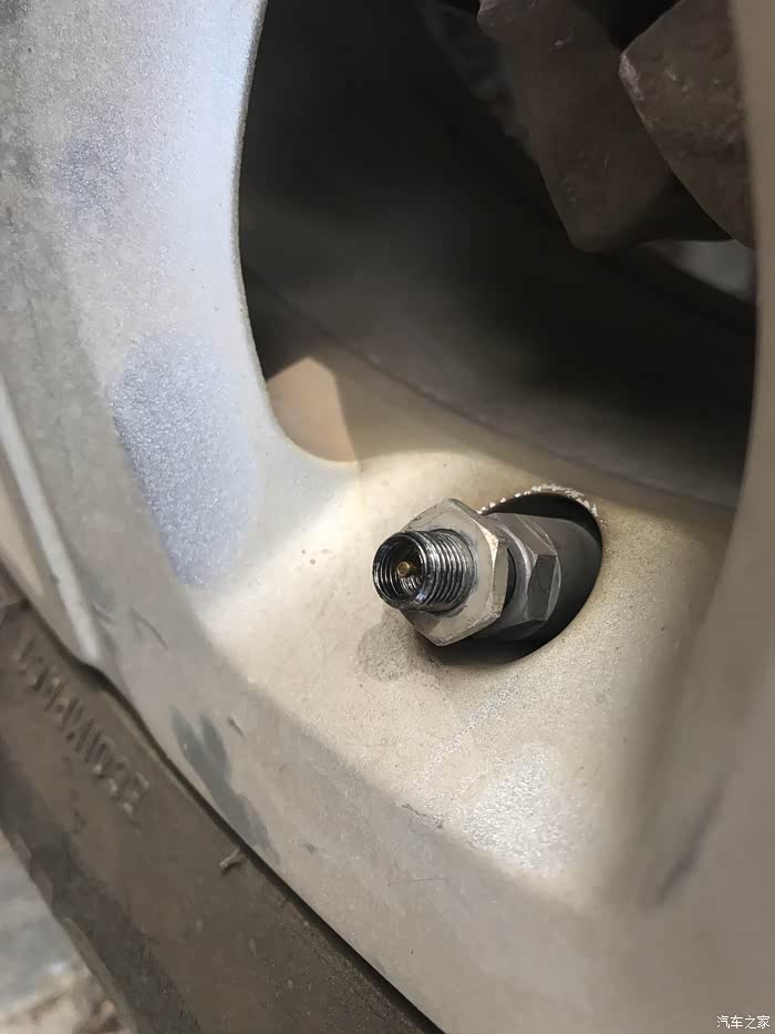 气门芯上的那个螺母就是反向拧出来,卡住测点外壳的。这样可以防止车辆行驶中甩飞的可能。这也是很多车友担心,总怕这个会甩飞,其实根本不会,我都用了5年了,也没甩飞啊!
