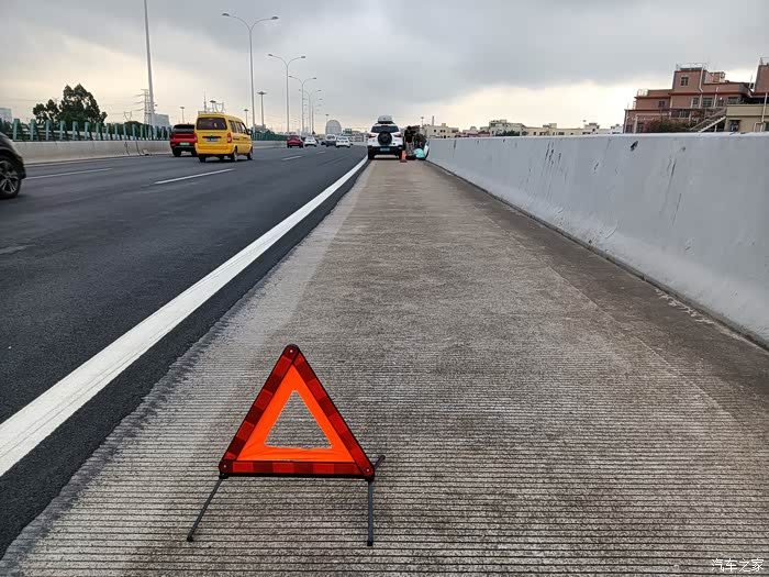 为了安全起见,我再多放置了一个雪糕筒警示标志在车尾,并让另外一个车友放到100米后面去。(此处只是为了拍照展示,后面有个三脚反光板的前提下。)