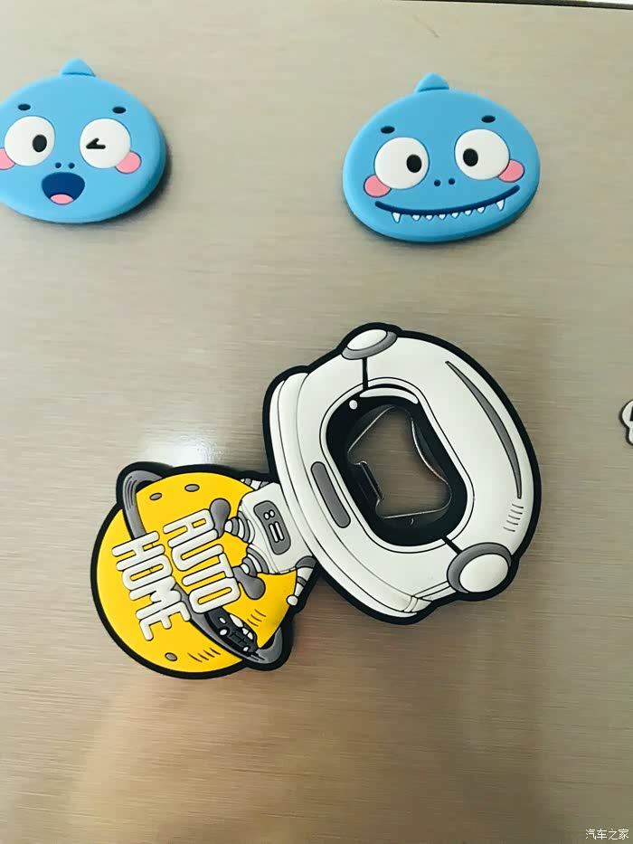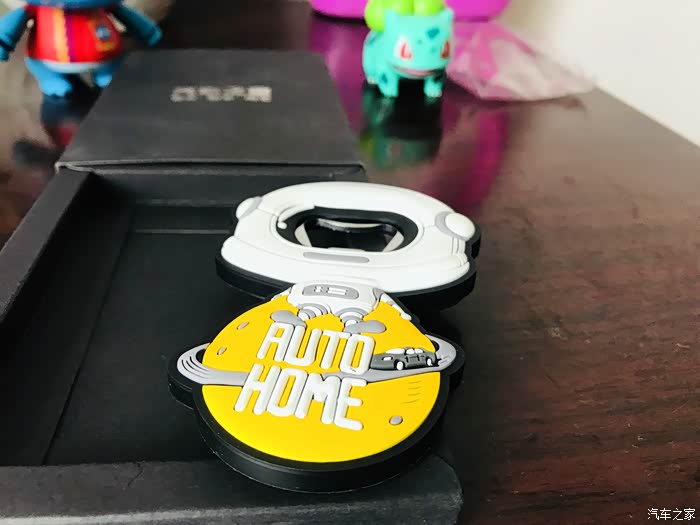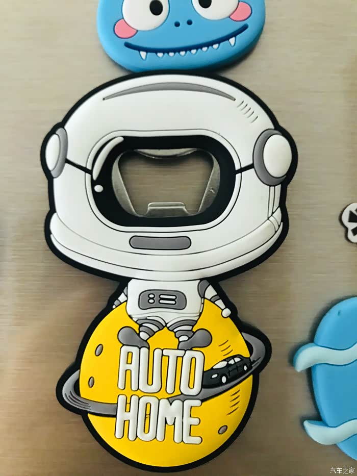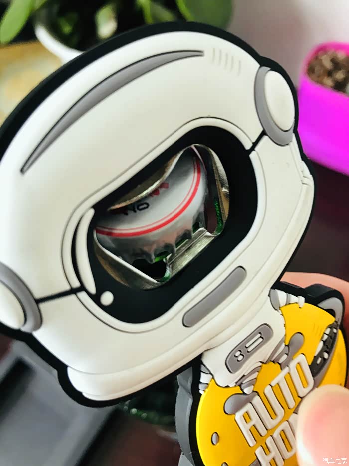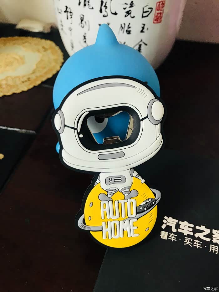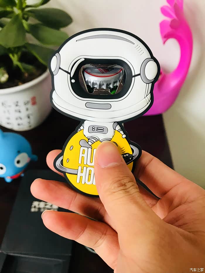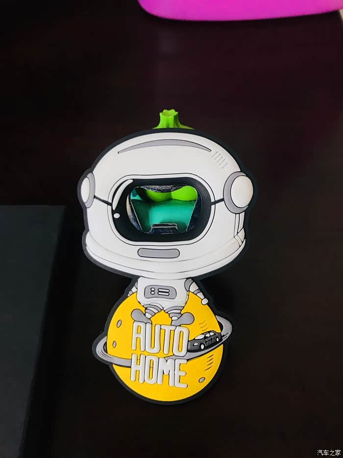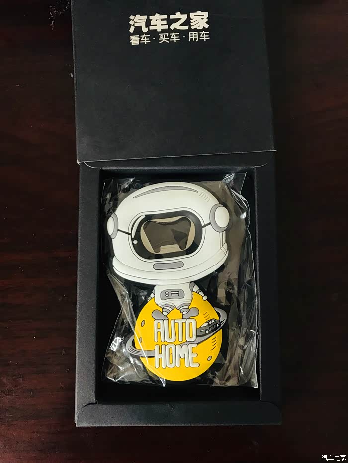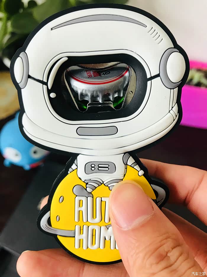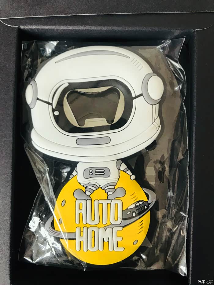 太空人开瓶器的开箱过程,虽然东西很小但是做工却很精致,正面采用软胶材质设计的一个太空人形象,最下面是一个汽车之家专属的黄色星球还有汽车之家的英文名称。