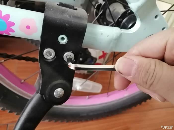 内六角扳手轻松调整女儿的自行车。