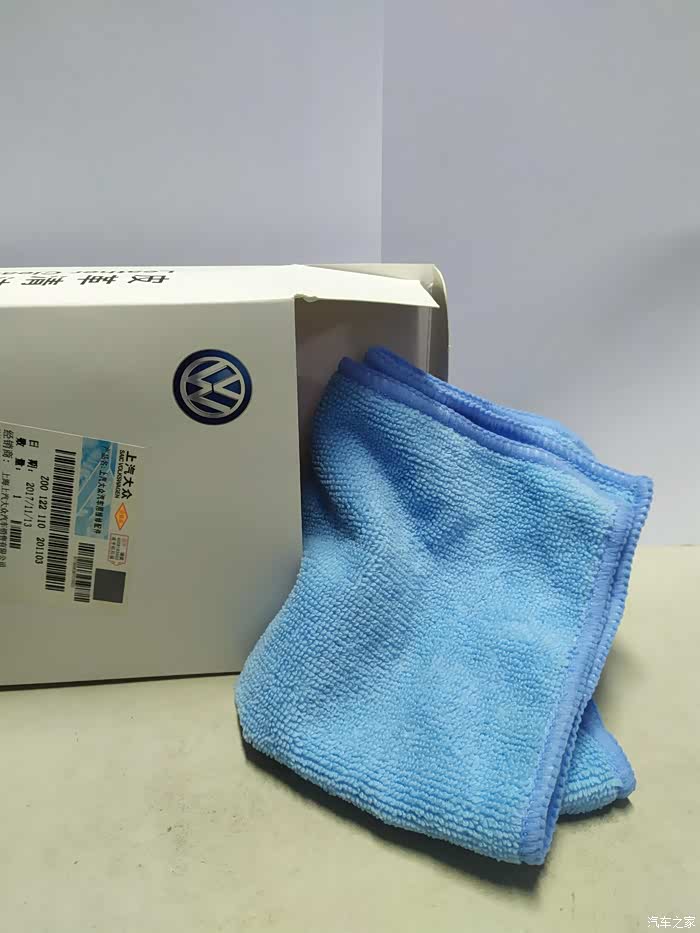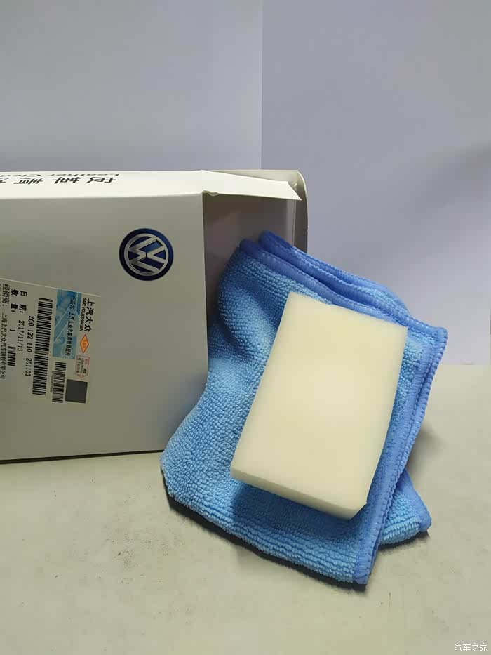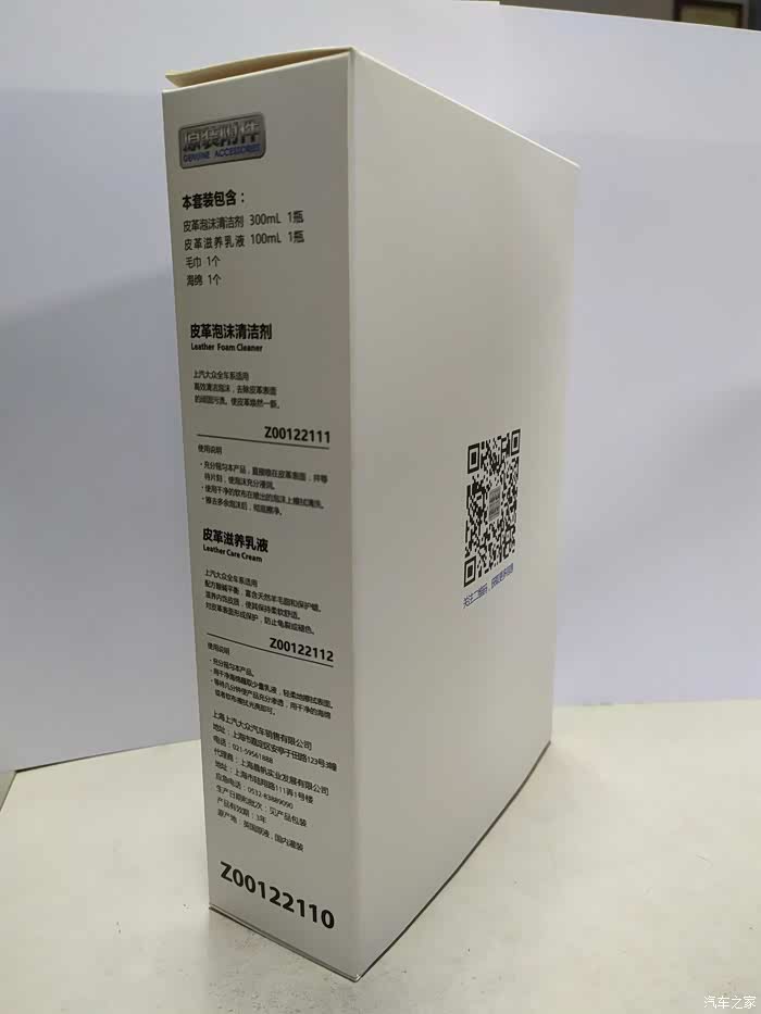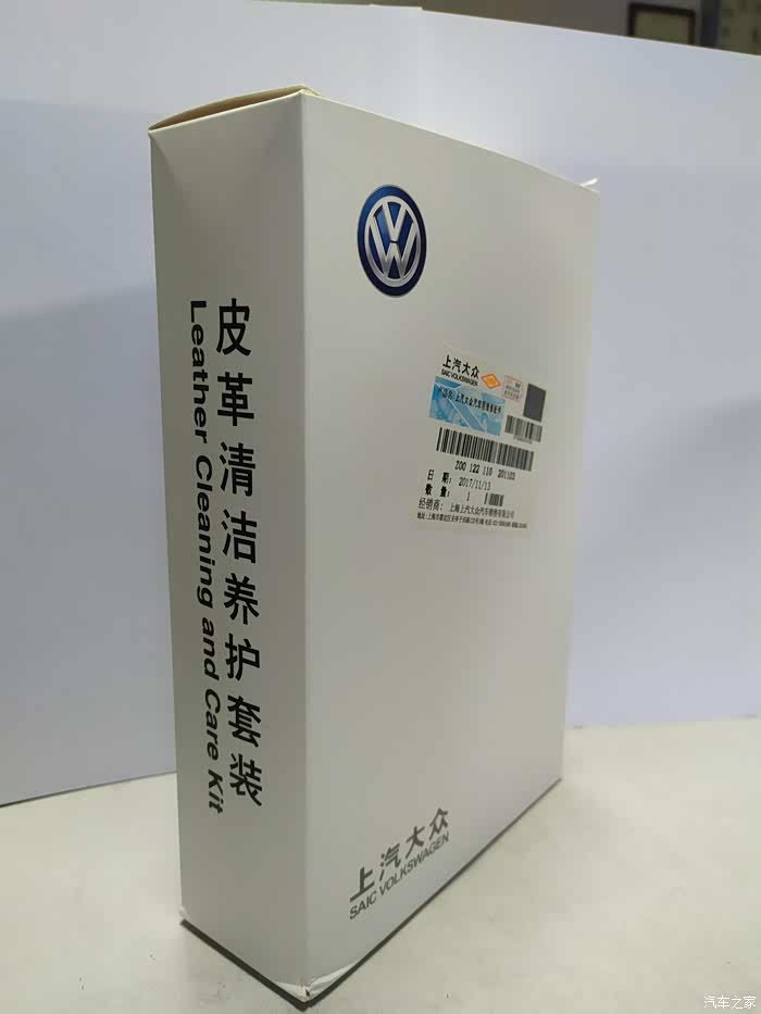 产品包装正面,非常干净简洁的包装,这是一套上汽大众原厂附件,标签上是生产信息和防伪标识等。