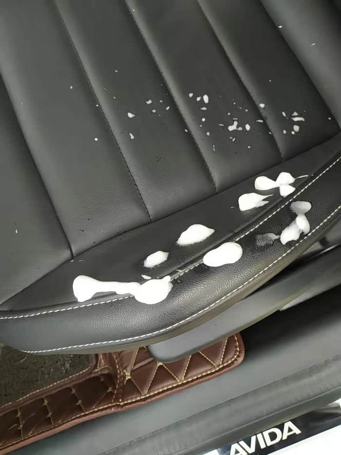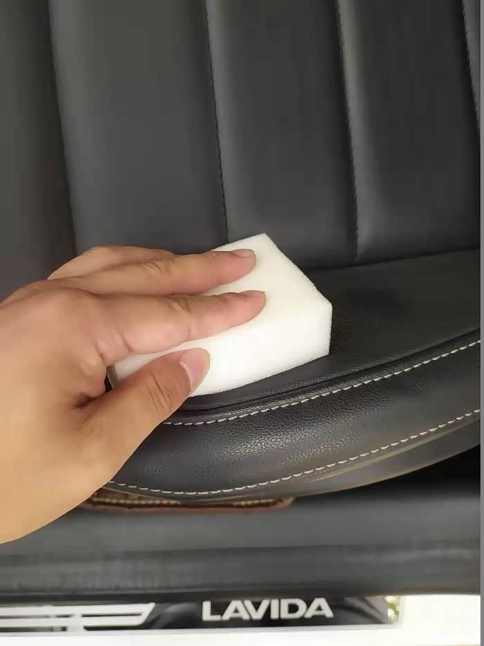 接着用倒上乳液的海绵擦拭座椅,这个要有耐心,一点点打一遍,从最边缘开始。