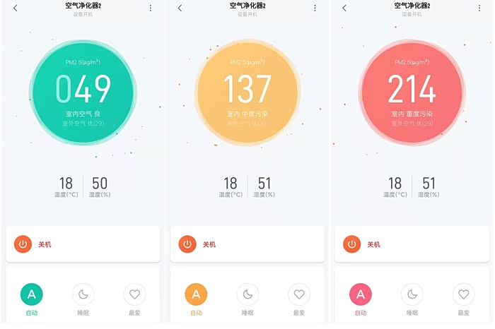 三个不同空气质量的显示图示,绿色是比较优,黄色是中度污染,红色是严重污染