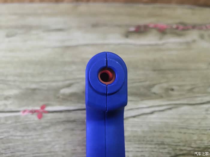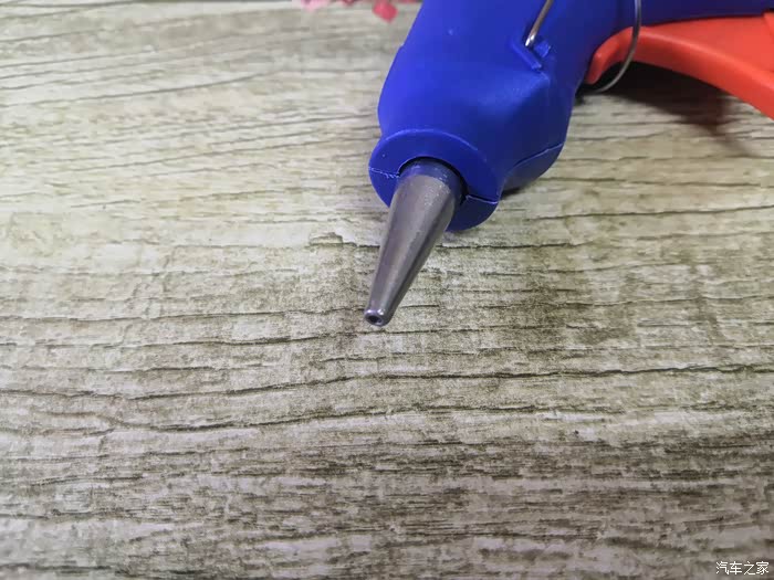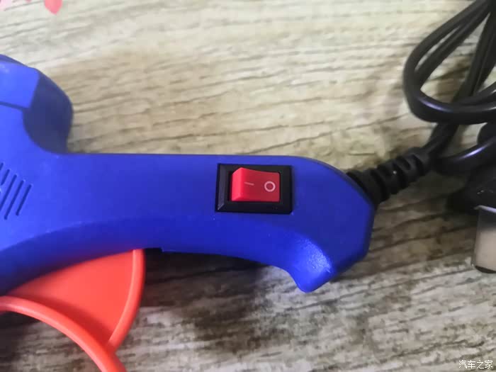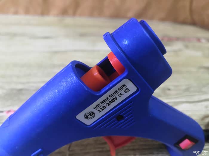 从外观上看,热熔胶枪的外观设计与枪类似,材料选择了蓝色塑料材质,在扳机、支架、胶嘴采用了亮光的红色搭配,整体上给人以安全可靠的感觉。
