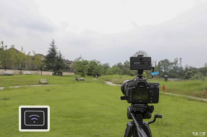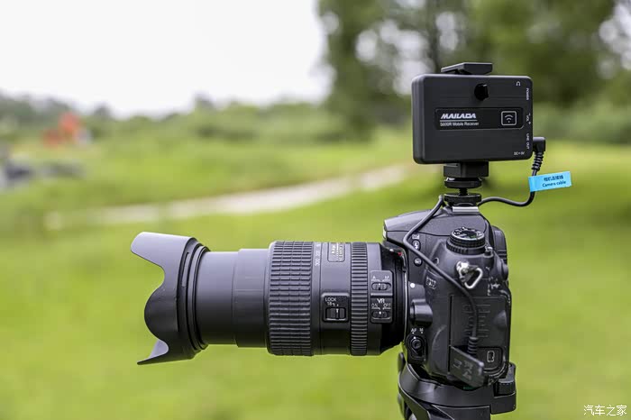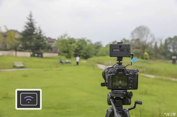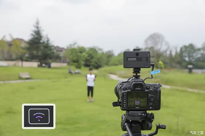 除了效果之外我们关心的还有接收距离,在室外我用麦拉达做了一个实际距离测试。使用的录制设备镜头为远端300mm,这也是我的最长的镜头。我们让一个人手持两个发射器通过不同的距离来检测信号接收情况,从接收器上我们可以看到两个发射器接收到信号指示灯是紫色。