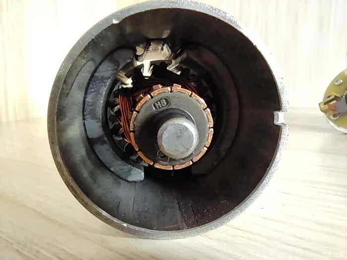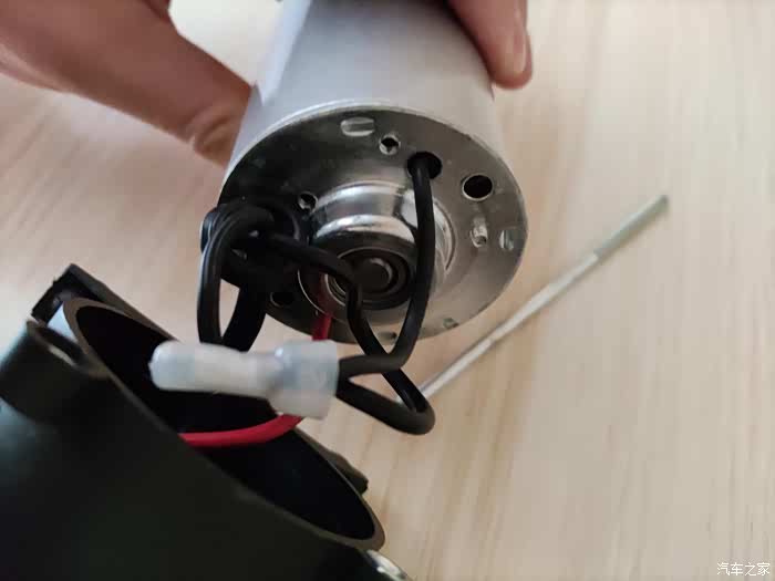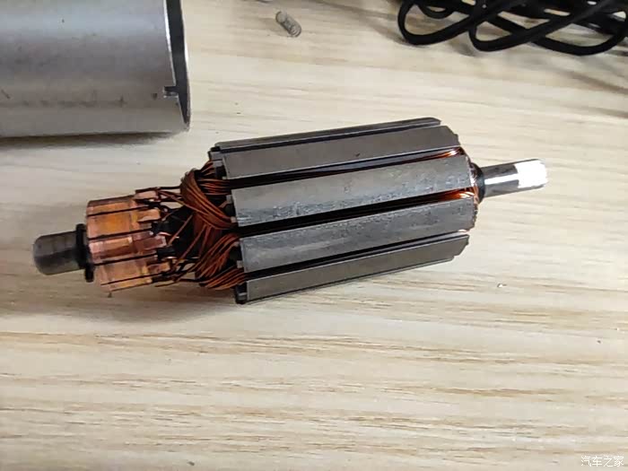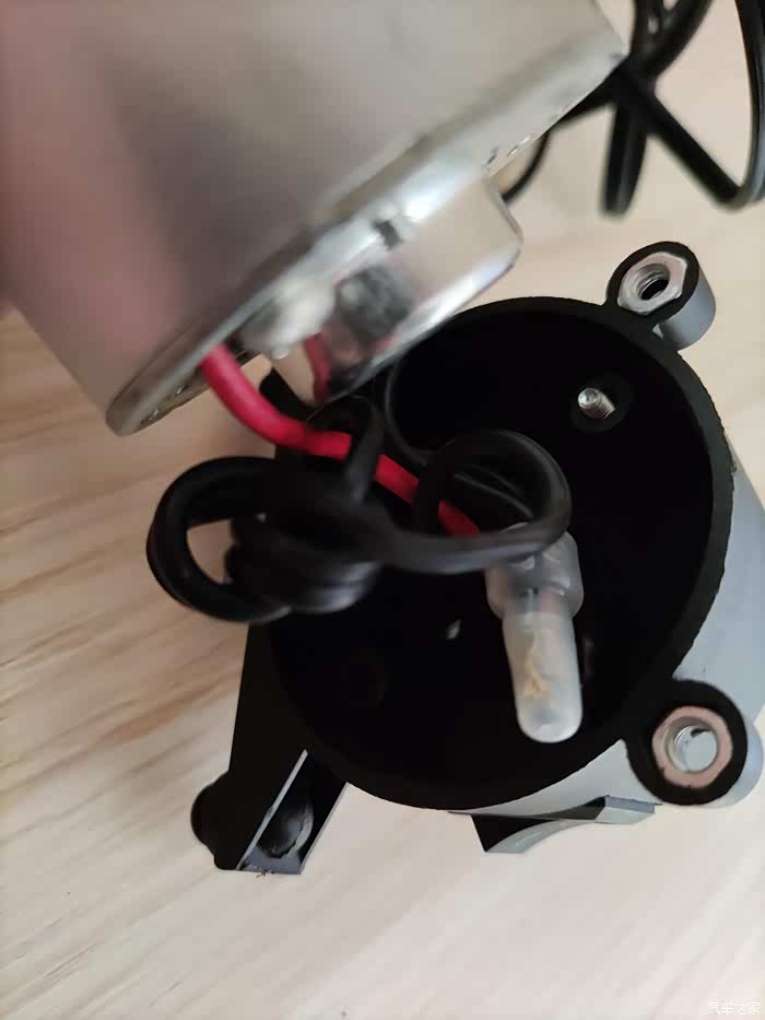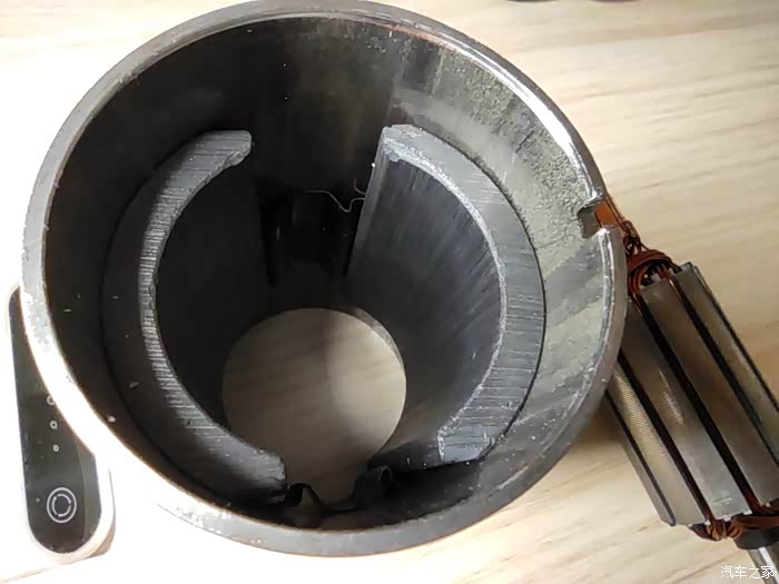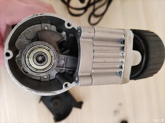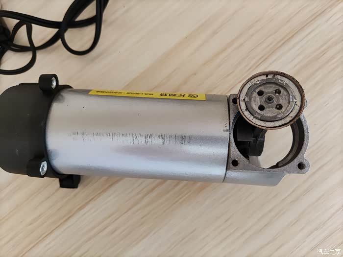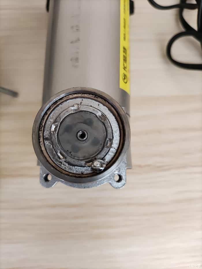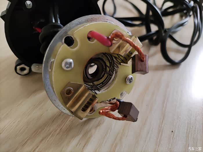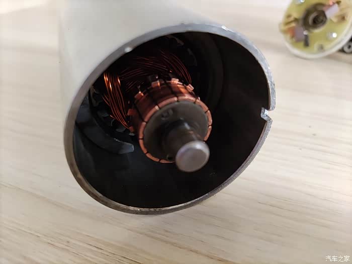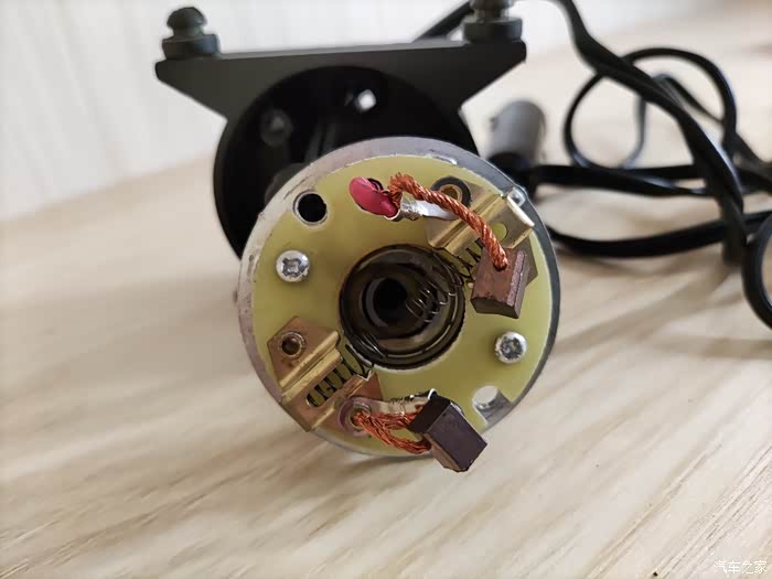 这次拆解有点暴力,因为有一个内六角的扳手我没有,只好使用暴力了。先从胎压表这次拆除镙丝,因为这侧的镙丝比较多。胎压表外侧的轮胎形状是胶皮套进去的,直接拨下就好。胎压表很简单,拆下后底部也没有什么连接,能看到一个密封的胶皮垫,而且胎压表下侧的全是铝合金的。回头拆开关这侧塑料封头,有线相连,里面能看到接线冒,线是不可插拨的,不能摘掉。两个特别长镙丝拿下后,整体就拆散了。这个时候就能够明显的看到,里面是由电机组成,转子的铜线看起来还挺粗的,定子就是俗称的吸铁石了。说实话和我想像的不一样。看转子整个材质用料还是十足的,碳刷还余有很多。其实他的工作原理有一些像车子的活塞,靠电机旋转上下进行充气的。但是我没有找到这款冲气泵的进气孔,所以我怀疑是不是和打气慢有一定的关系。