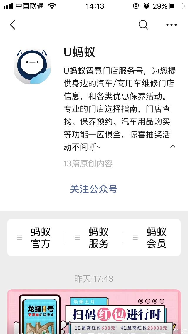 扫描后是 一个叫u蚂蚁智慧门店的公共号 里面有一些和车辆有关的文章
