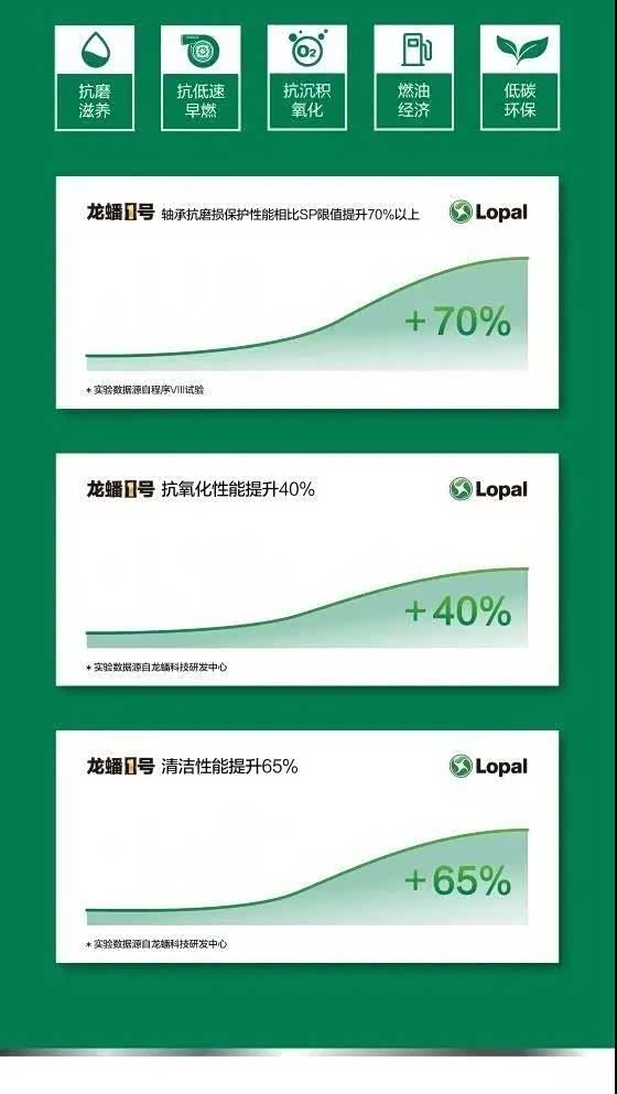 相比于SN PLUS等级的润滑油,龙蟠1号产品抗氧化性能提升40%,清洁性能提升65%;轴承抗磨损保护性能相比SP限值可提升70%以上。