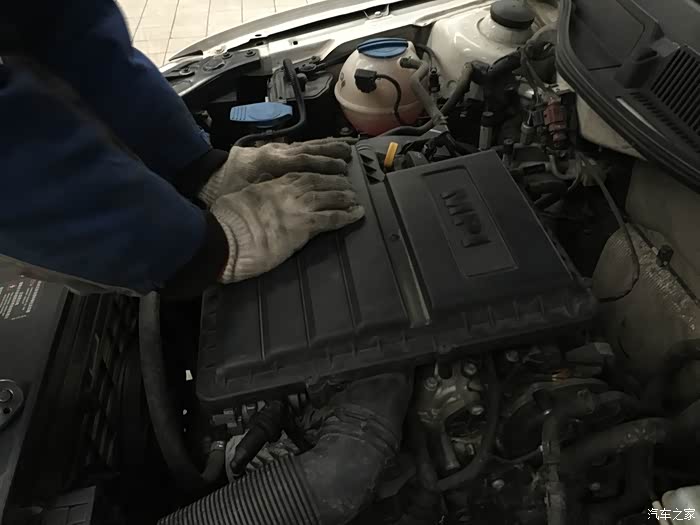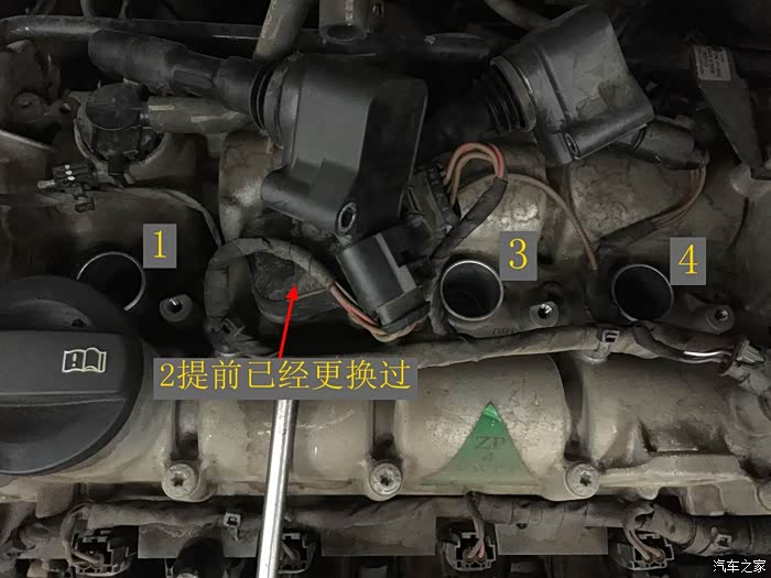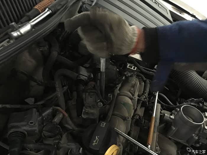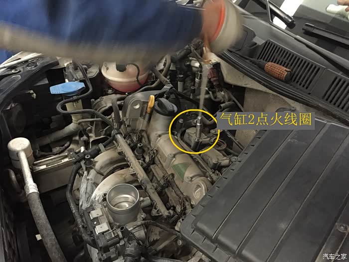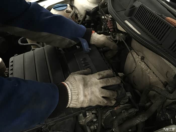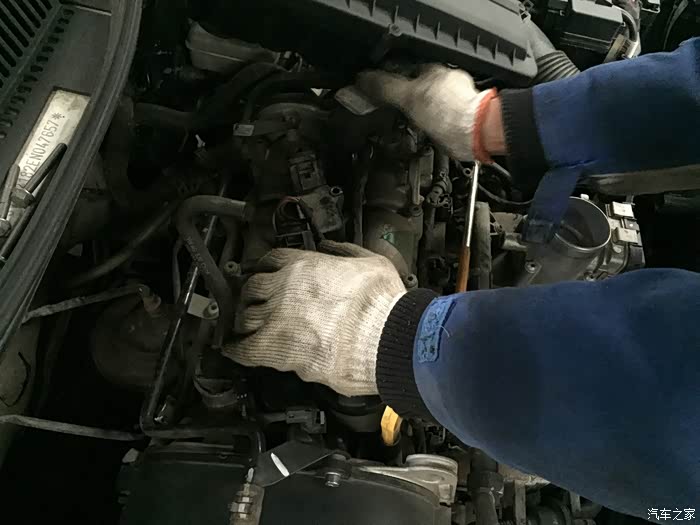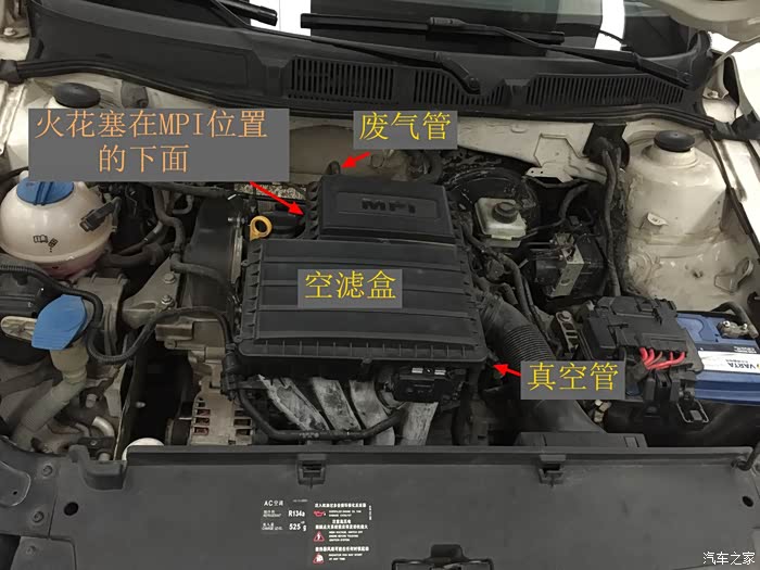 于是技师主管让先更换气缸2的火花塞试试看。火花塞在空滤盒MPI位置的下面,更换时需拔下连接在空滤盒二测的真空管、废气管,然后将空滤盒移动到一边才能实施更换。