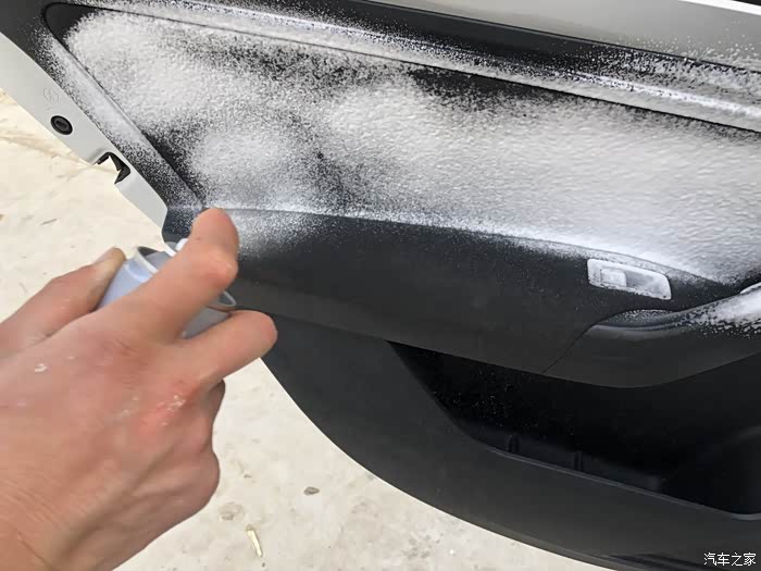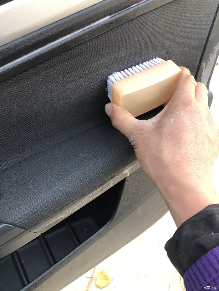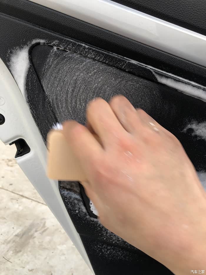 2、如果比较脏,那么我们要用泡沫清洁剂来清洗了,现在市面上有很多专门针对织物座椅使用的泡沫清洗剂。喷上之后先用毛刷刷,然后用柔软的干毛巾擦拭。