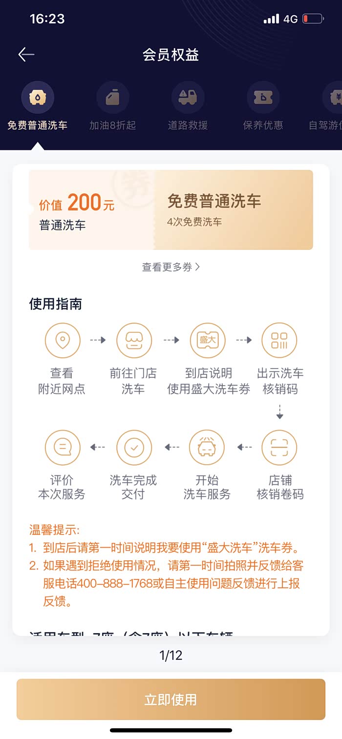 之家黄金会员自带的福利之一,免费四次洗车,网点还算比较多,这个就在家门口几百米的距离。