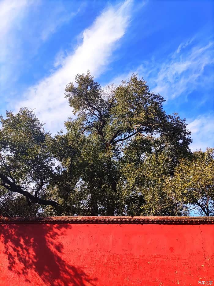 红墙绿树!很奇怪,外面的树叶都黄了,唯独这棵树依然枝繁叶茂!似乎佛赐予它了灵性!