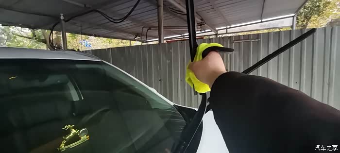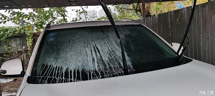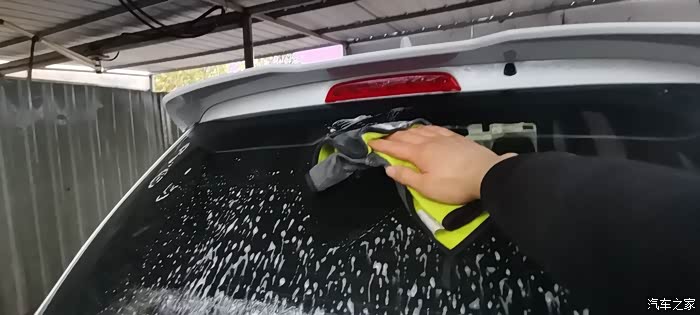 开始洗车了,先把车顶洗完,然后洗一下前挡玻璃。