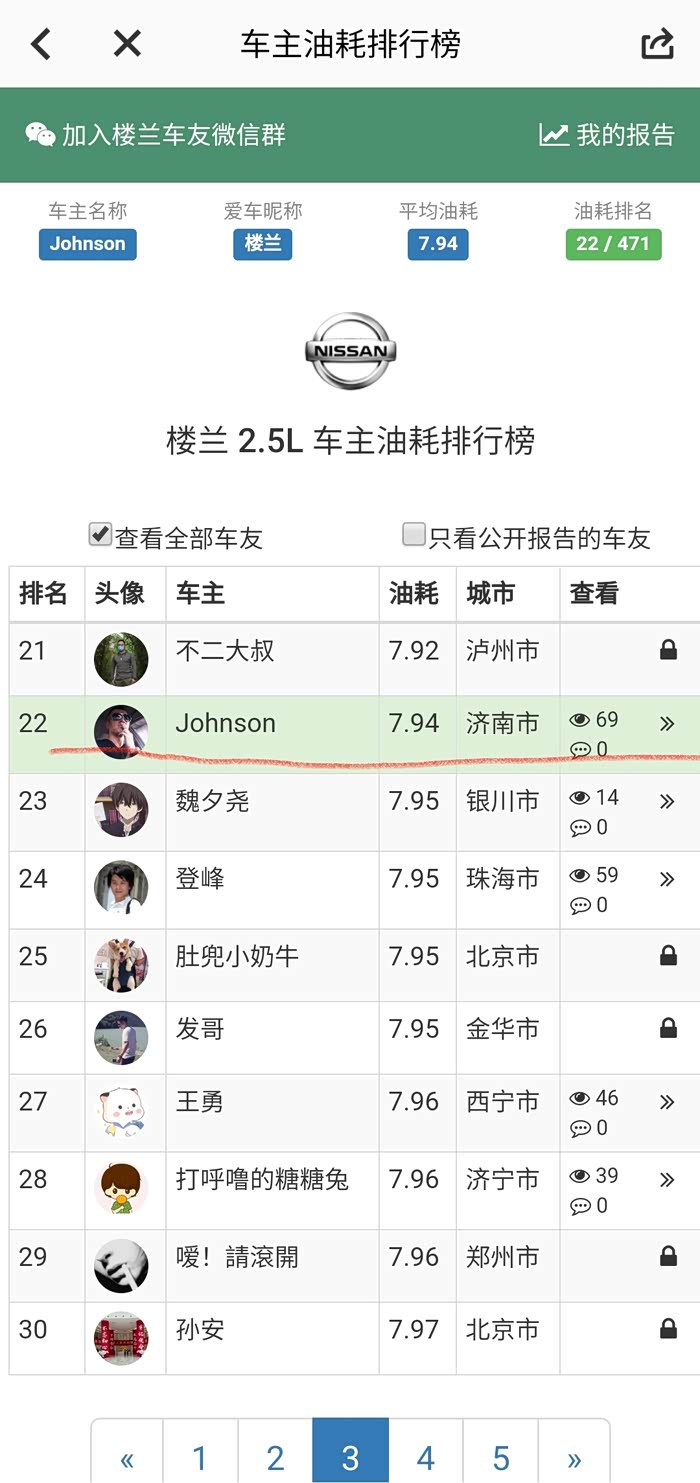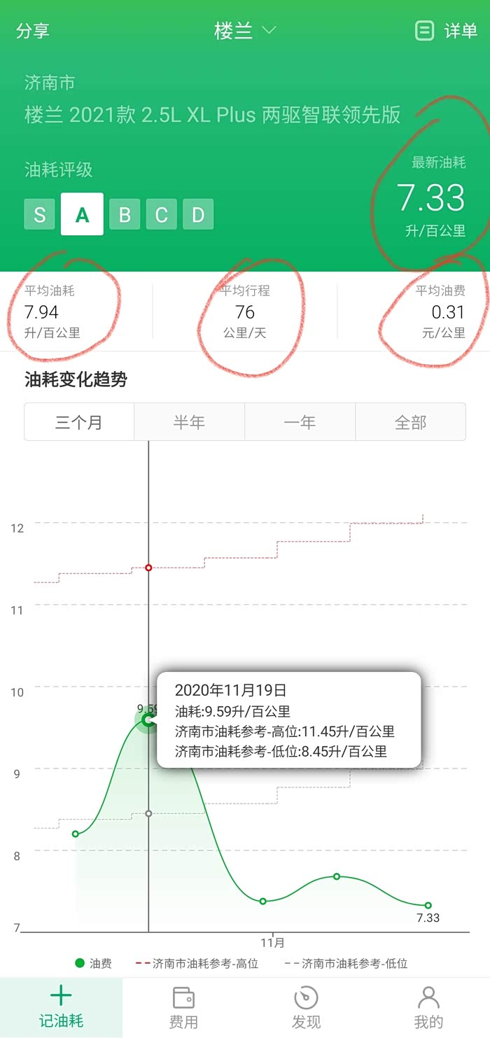 首先车款型号为2021款自吸顶配Plus领先版,用车环境设定在我亲爱的大济南,号称车多路窄红灯长的全国”首堵"城市。其次通勤里程为每天大约70~80公里(视实时路况选路而定),通勤路况基本为一半高架一半国道,偶尔可以选择走一段高速,但不超过通勤里程的10%。目前共加过六次油,最近这箱油的表显最佳单程油耗是5.8,总平均表显油耗是7.4,平均车速是34KM/H;用小熊油耗APP记录的油耗成绩为:最高9.59(第二箱油),最低油耗7.33(本次第六箱油耗),总平均油耗为7.94。根据小熊油耗提供的全国楼兰2.5L用户大数据统计,我的平均油耗成绩排全国第22名,山东第一名。(当然绝对不排除有节油大神们未公开数据统计导致我暂时捡漏了)