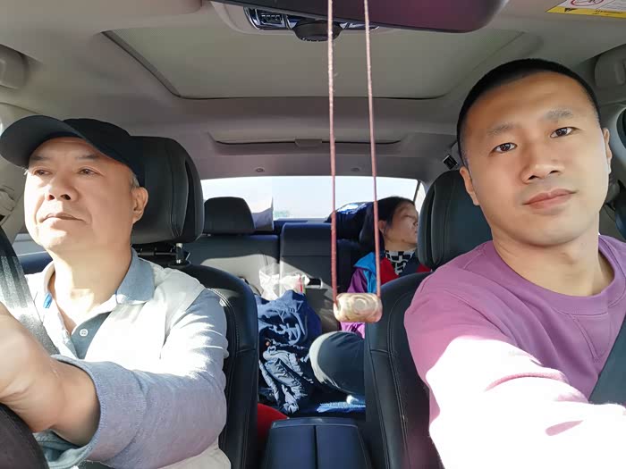 自拍一个(照片是镜像的),母亲已经在后排睡着了,相当的享受。也亏了这车空间够大,我175的身高,座椅调节合适了,后排翘着二郎腿依旧没有任何压力,而且行驶起来相当安静,底盘稳健,这车的确性价比超级高。