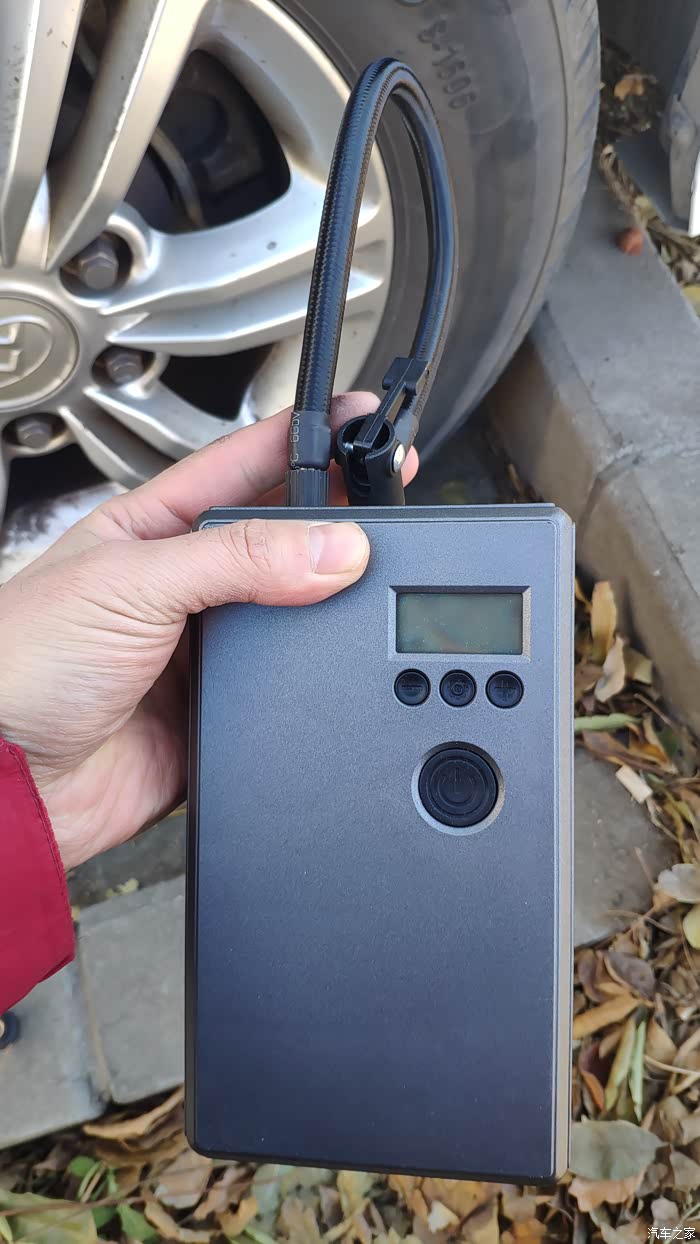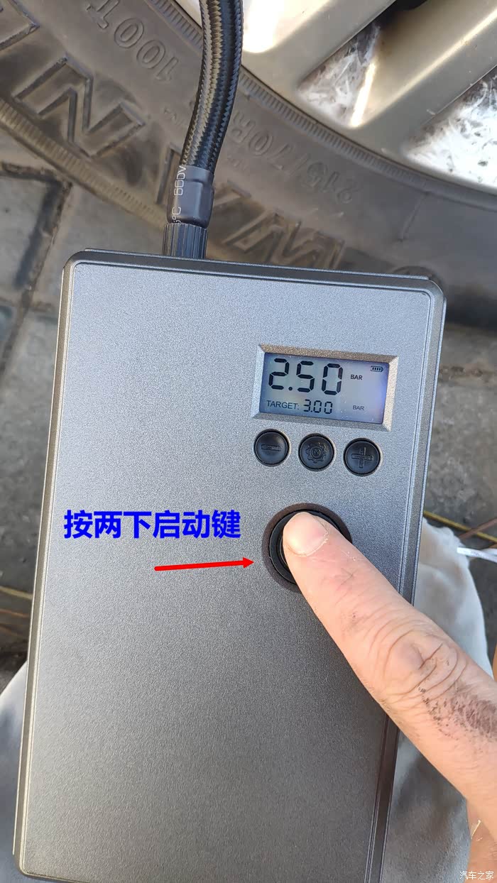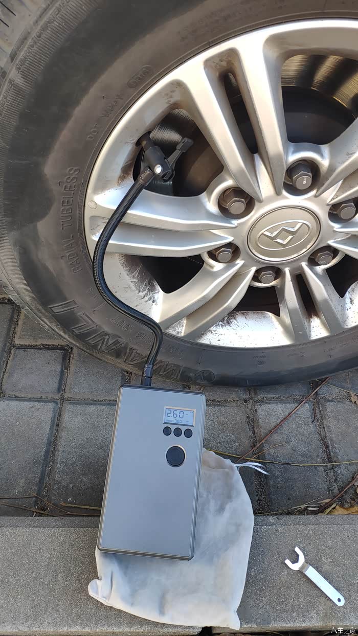将固定杆掰到竖直状态,掰的同时往外拔,确保少漏气。再将胎压监测仪装上,一个轮胎充气完成。依次再把其他三个轮胎充到3.0,共耗时不到15分钟。