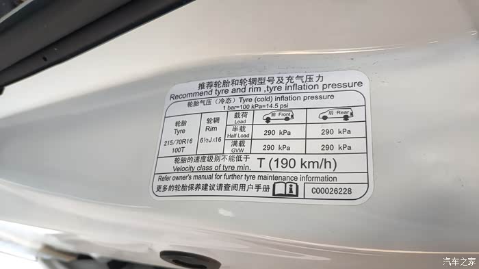 根据说明书,胎压前后都是2.9,还可以在主驾侧门框铭牌上查看。
