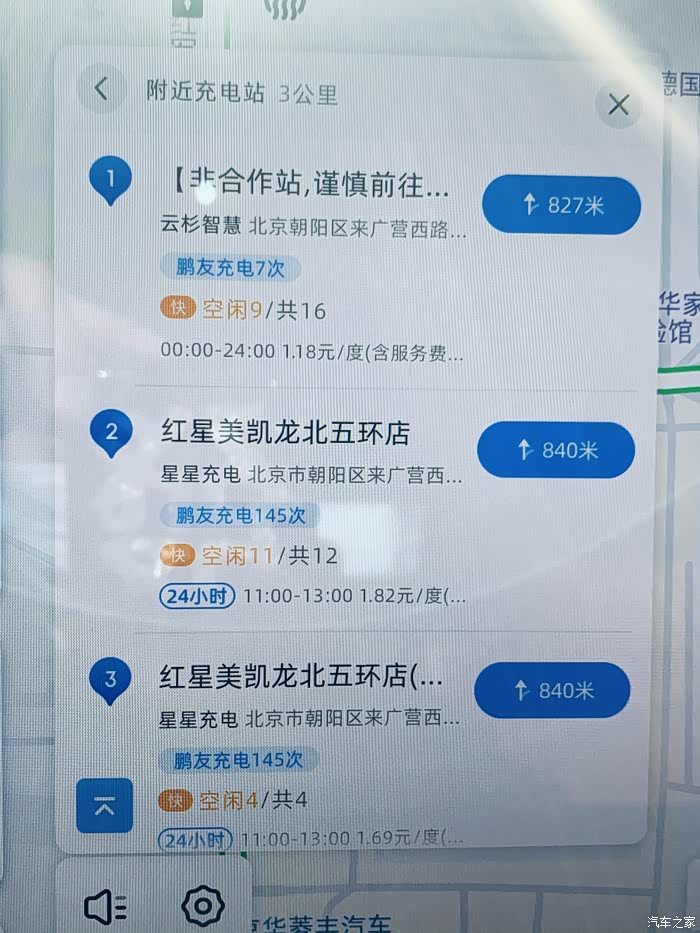 大屏上附近的充电站,近期小鹏车友去过的次数及充电桩空缺位一幕了然。