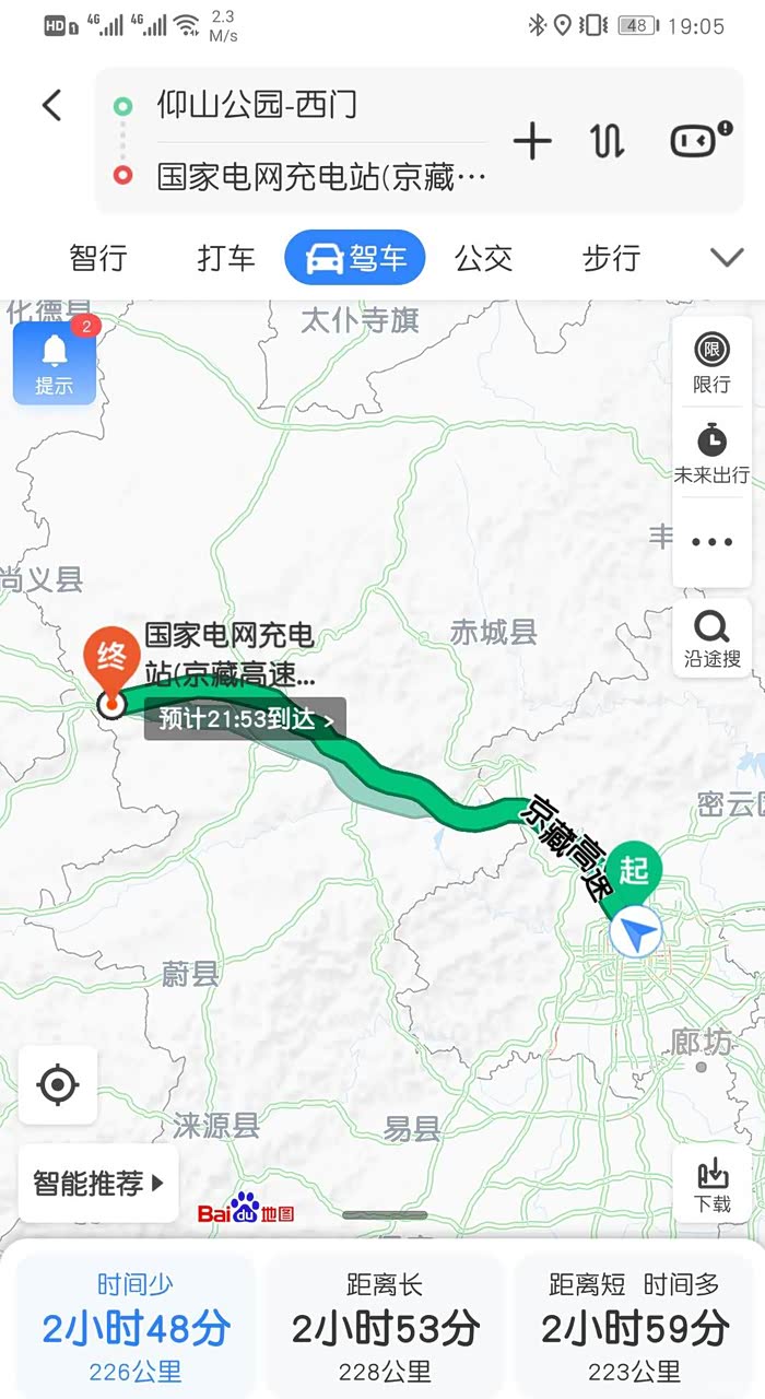 出发时楼主选了两种出行方案:①到张家口南服务区充电(路程184KM);②到景家山服务区充电(路程226KM)。之所以选了张家口服务区,是因为楼主以前从未开过单程200公里以上的路,所以心里没什么底,但等过了张家口服务区以后楼主发现,这种担心是多余的,390KM续航开到景家山还有28KM,而且楼主只是开了高回收,没开ECO,如果开了ECO再慢一点完全没有问题。