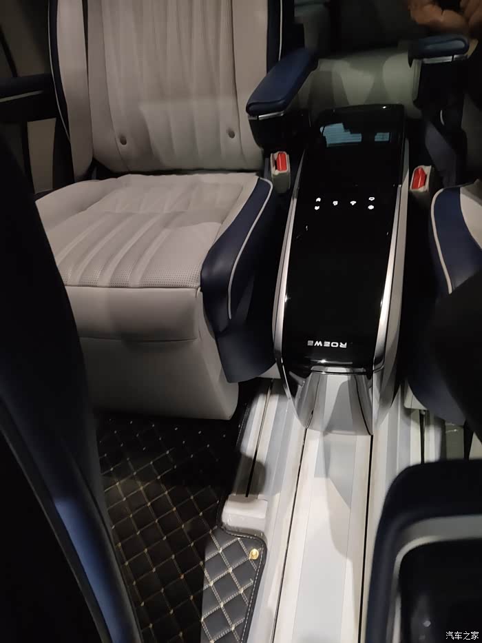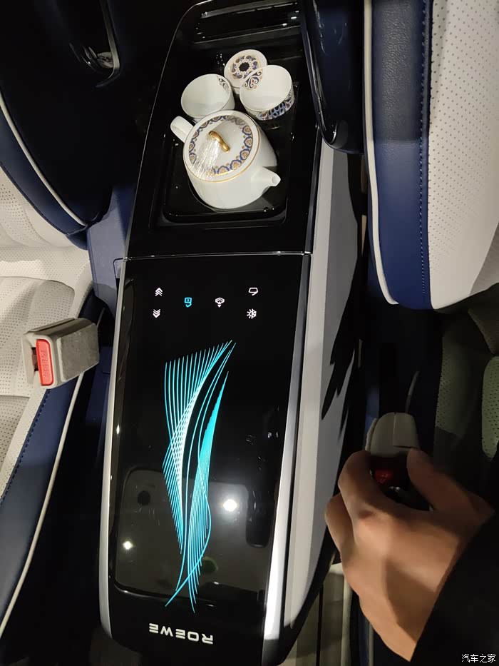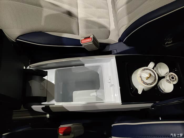 中间有个非常好玩的东西,叫什么移动魔吧,这一从第一排移动到第三排,打开前面是一个车载小冰箱,可以放下四罐可乐,是可以支持3°~55°的温度调节的,夏天冰可乐,冬天温牛奶都是可以的,后面的话是一个茶具台,放茶叶罐,水杯,这些的接送客人的时候,可以直接在车上喝喝茶感觉还是非常好的,而且他这个可以选装不同的路线,咖啡具的选装包,喝雪茄的选装包都可以选择,满足不同的人,不同的需求。