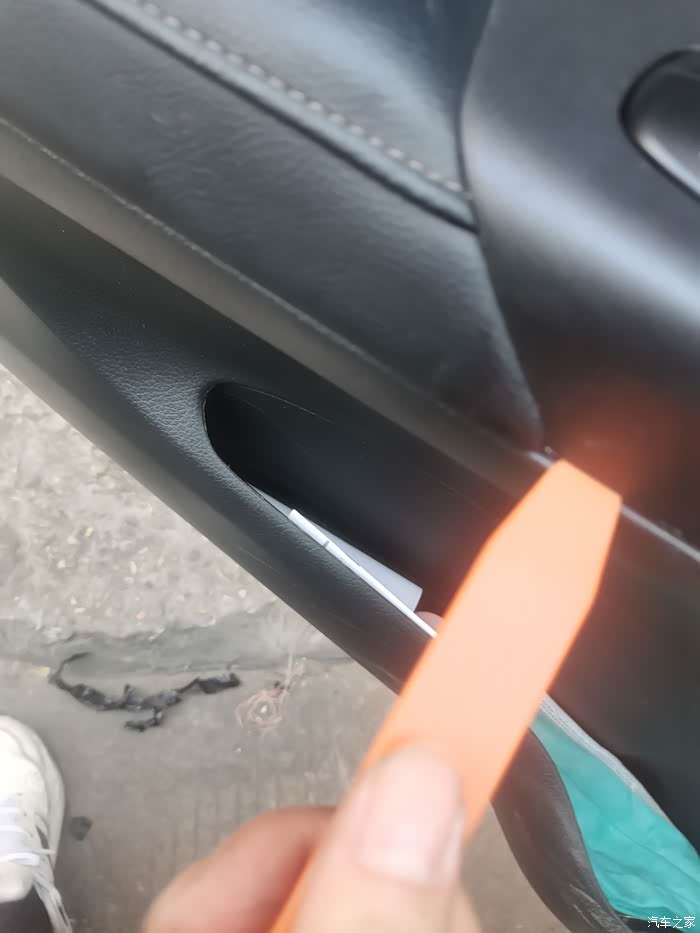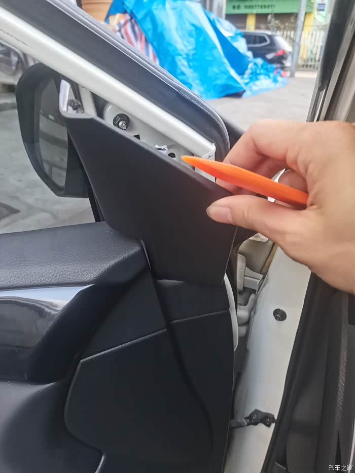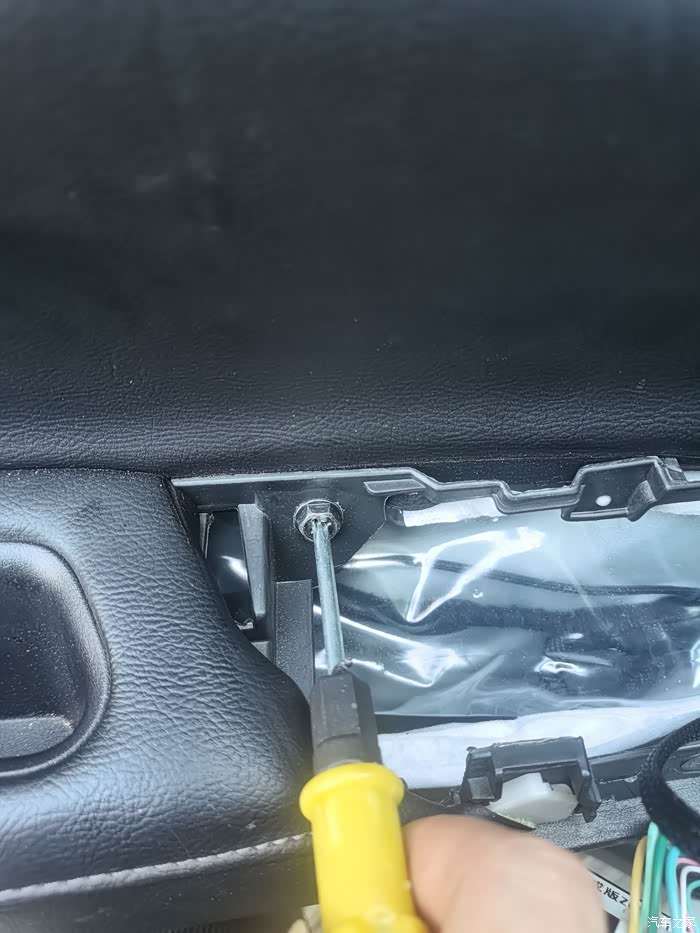 取出面板后,内部一颗螺丝松开,然后就可以把车门内饰板取下了,可以放心用点力气,都是几个卡扣扣住的。