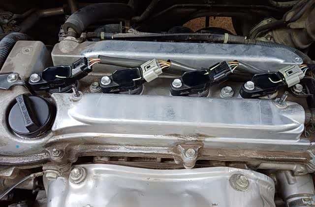 程序是打开机舱盖,卸下发动机盖板,就露出了一排四个火花塞高压线圈,拔下连接线,卸掉压高压线圈的螺丝,就可以拔出高压线圈了,用套筒扳手卸下旧火花塞。