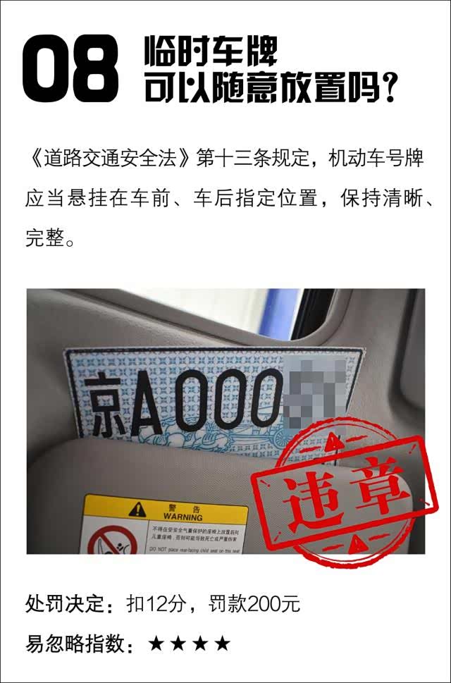 临时车牌虽然“临时”,但可不随便哦。不光不能随意放置,张贴位置还有严格规定。一张粘贴在车内挡风玻璃的左下角或者右下角,以不阻挡驾驶人的视线为准;另一张粘贴在车后窗玻璃的左下角。如果将临时车牌随意放置在车上或者张贴的位置不对,就将面临处罚。