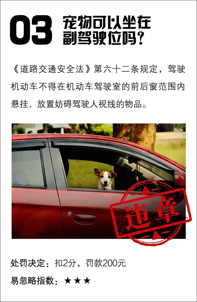 “铲屎官们”为了方便看顾,喜欢把宠物放在副驾驶,但已经有人因此被罚了。宠物在副驾驶,属于“妨碍安全驾驶”。因为小动物生性好动,极易干扰驾驶员的视线,因为小动物生性好动,极易如果误按到车上的按键,很大可能给驾驶员和车辆造成不良影响,甚至引发交通事故。