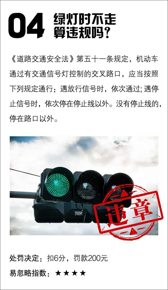 等红绿灯时松懈一下神经,相信大家应该都有过这样的经历。看看四周,和车内友人聊上两句,然后注意力就被分散了,跳绿灯了也没发现。闯红灯属违章谁都知道,可你知道吗?绿灯亮起时停着不走也是要扣分的!因为这样极容易影响其他车辆通行,造成交通堵塞。