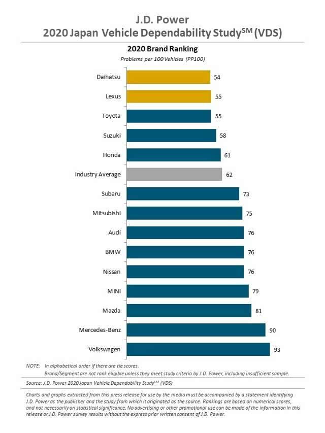近两年,日系车凭借独特的优势,逐渐受到了国内消费者的青睐,而像丰田、本田、斯巴鲁、日产以及马自达等品牌,都是大家非常认可的。那么在日本本土,日本人最认可哪些汽车品牌呢?根据J.D.Power发布的2020年日本汽车可靠性报告来看,雷克萨斯再次失冠,丰田、铃木和本田位居前五,而斯巴鲁、三菱、日产和马自达的表现都处于平均值之下。不过让大家意想不到的是,在我们国内非常受欢迎的德系车品牌,却遭到了日本人的“嫌弃”,奥迪、宝马和Mini都处于平均值之下,而奔驰和大众汽车更是排名垫底!