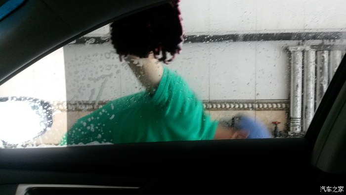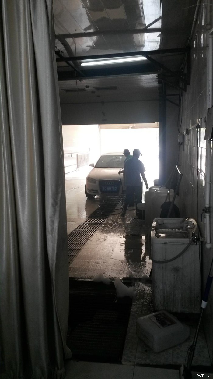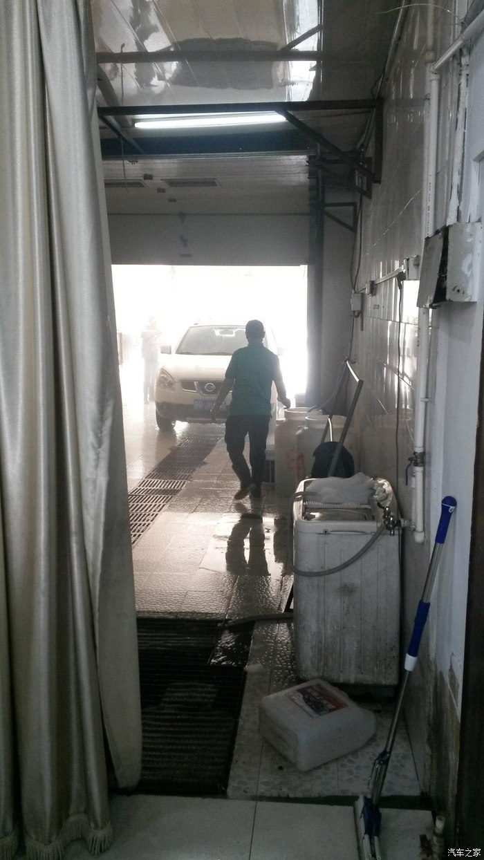 进入洗车房,水冲洗,值得提的是涂泡沫全是靠人工手握毛线类洗车部洗刷,一般洗车店使用墩布一类的产品涂刷泡沫,操作不好容易划伤车