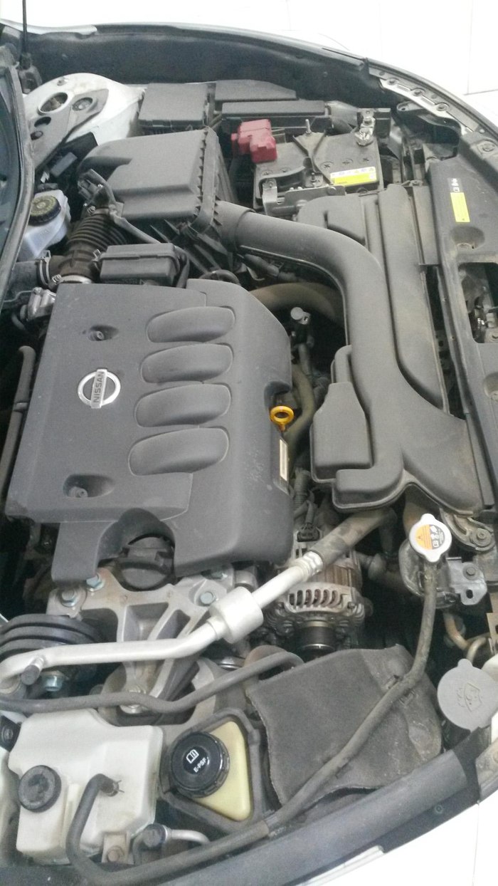 另一个技术打开发动机舱,准备擦洗发动机舱表面,此时没擦拭前