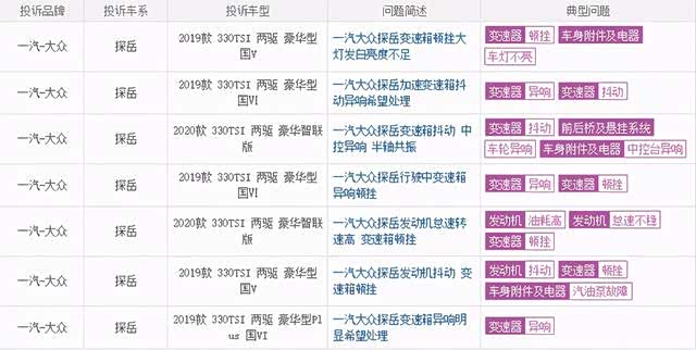 作为途观L的“表兄”,探岳同样拥有不错的销量,但也正是由于二者的“表兄”关系,探岳的动力总成同样投诉量较高。首先探岳投诉量较多的是变速箱顿挫、变速箱异响以及发动机油耗高,与途观L的投诉问题大同小异。