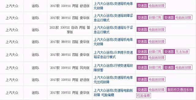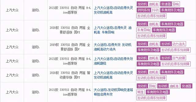 同时途观L还被投诉油耗高,发生了自动启动失灵的情况,甚至还有出现动力消失的状况。而途观L所采用的是1.4T、2.0T低功、2.0T高功发动机,均匹配7挡湿式双离合变速箱,整套动力总成的动力输出表现不错,其2.0T高功车型甚至能实现6.5秒破百(实测)。但根据投诉来看,途观L更应该提升的变速箱的稳定性。