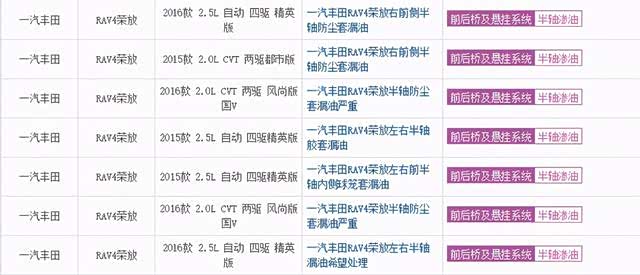 其次,丰田RAV4荣放被投诉的另一个原因在于半轴渗油及球笼套渗油,而该问题主要集中于2015款及2016款车型。虽然2015款车型上市已5年,但按理来说橡胶会有一定老化,但并不会老化至渗油的程度,这一点也值得丰田深思。