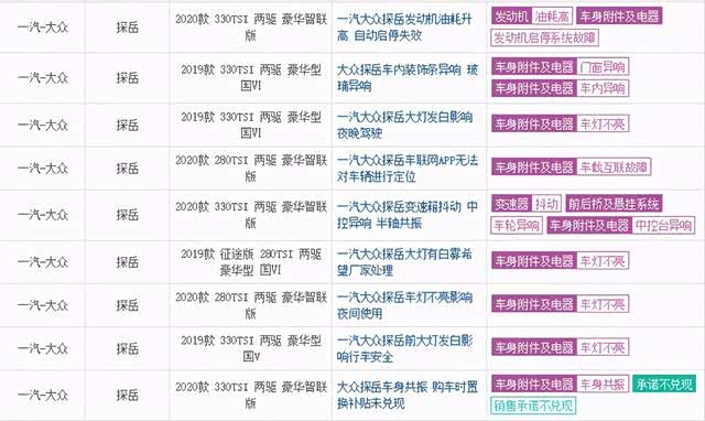 其次就是探岳居然被投诉车灯不亮,并且其投诉量还不少,要知道探岳标配LED大灯,像这类小问题它虽然不会产生根本影响,但却会影响使用体验。此外,探岳还被投诉异响、车载互联故障。作为合资车企,品控一定要尽快提上来。