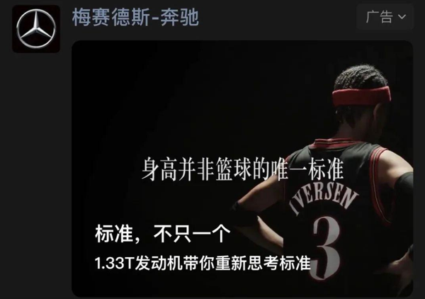 奔驰近一两年最大的变革就是推行汽车小排量化,比如E级新增1.5T版本,G级增加2.0T,GLA新增1.3T,GLB在1.3T的基础上又新增1.3T更小功率版本,这种简配的事情没几个消费者会觉得高兴,所以骂声也一直很多。还不止于此,在去年12月17日,梅赛德斯-奔驰推送的一条广告视频中,还恬不知耻地说道:“标准,不止一个,1.33T(1.3T)发动机带你重新思考标准”,简配就简配呗,还好意思宣传。同时在此视频中公然山寨、碰瓷著名篮球运动员—阿伦·艾弗森(AllenIverson),把视频中球衣上的名字改成“Iversen”,与“Iverson”仅一个字母之差,堂堂豪车品牌,做这种下三滥的事,也是让人服气。