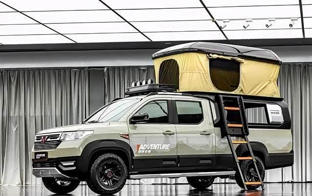 越境征途车型的车顶装配了带电动遥控升降折叠的露营帐篷,通过侧面折叠梯上下进入露营帐篷。