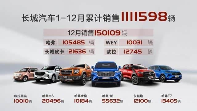 根据数据显示,2020年长城汽车共计销售新车1,111,598辆,同比增长4.8%。超过102万辆的年度销量目标,目标完成率达109%。